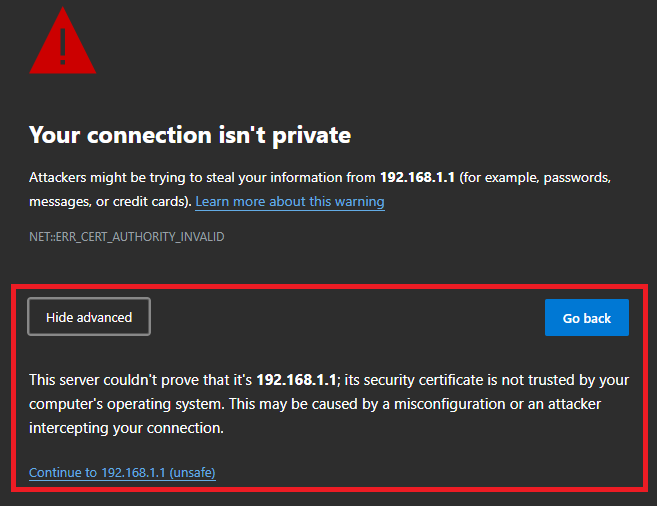 To continue, click “Advanced” on the browser warning, then click “Continue to [router address] (unsafe)”.
